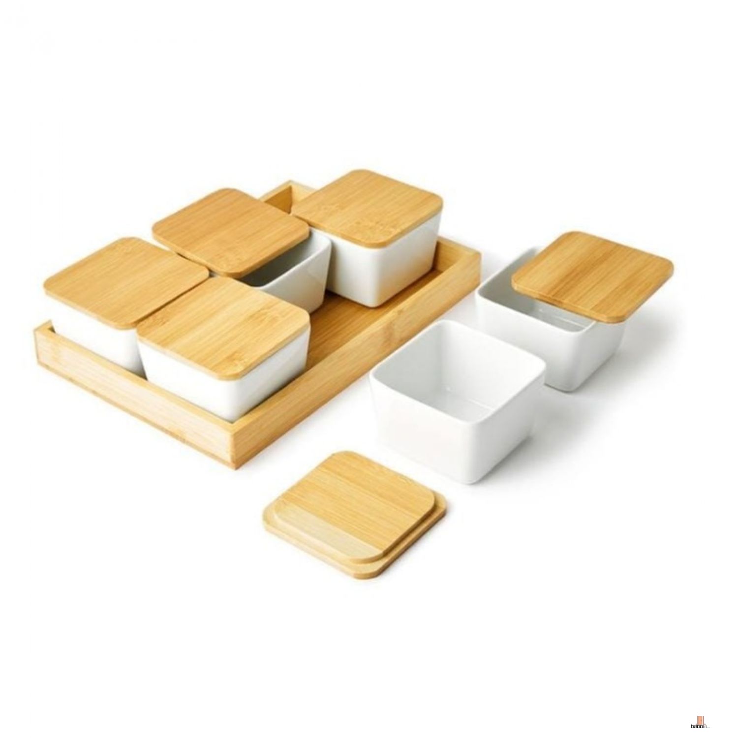 طقم تقديم يتكون من 6 سلطانيات سراميك + 6 اغطاء خشب + صينيه خشب