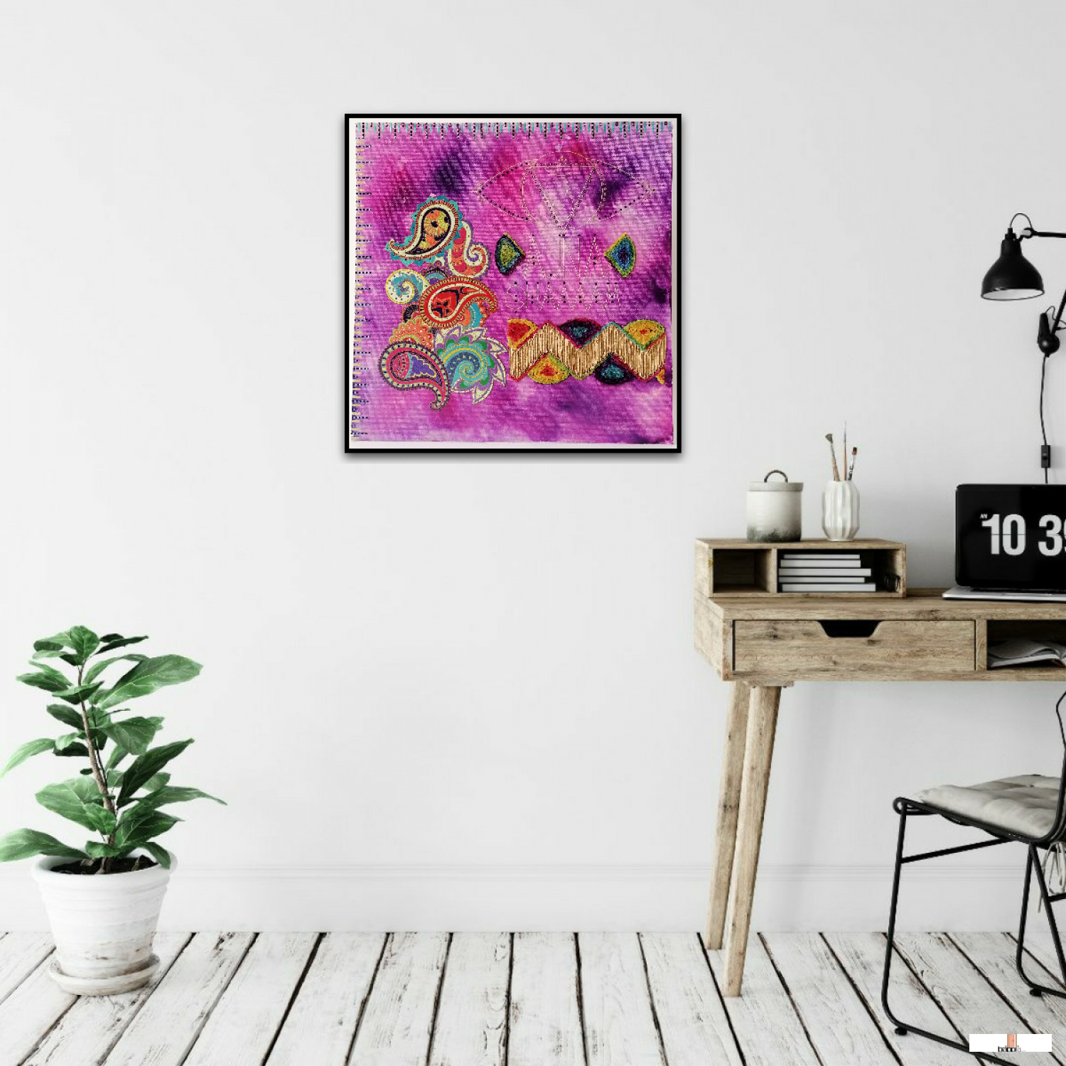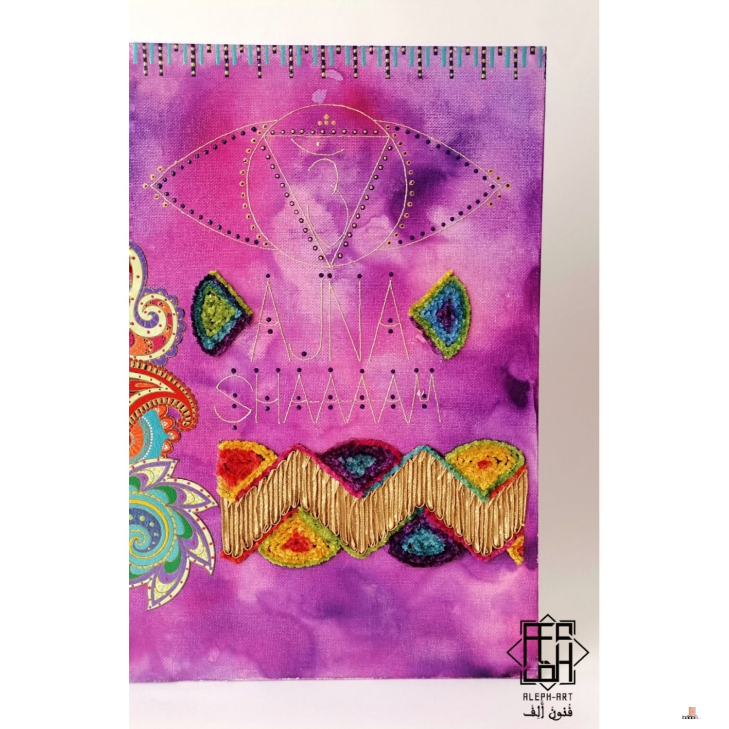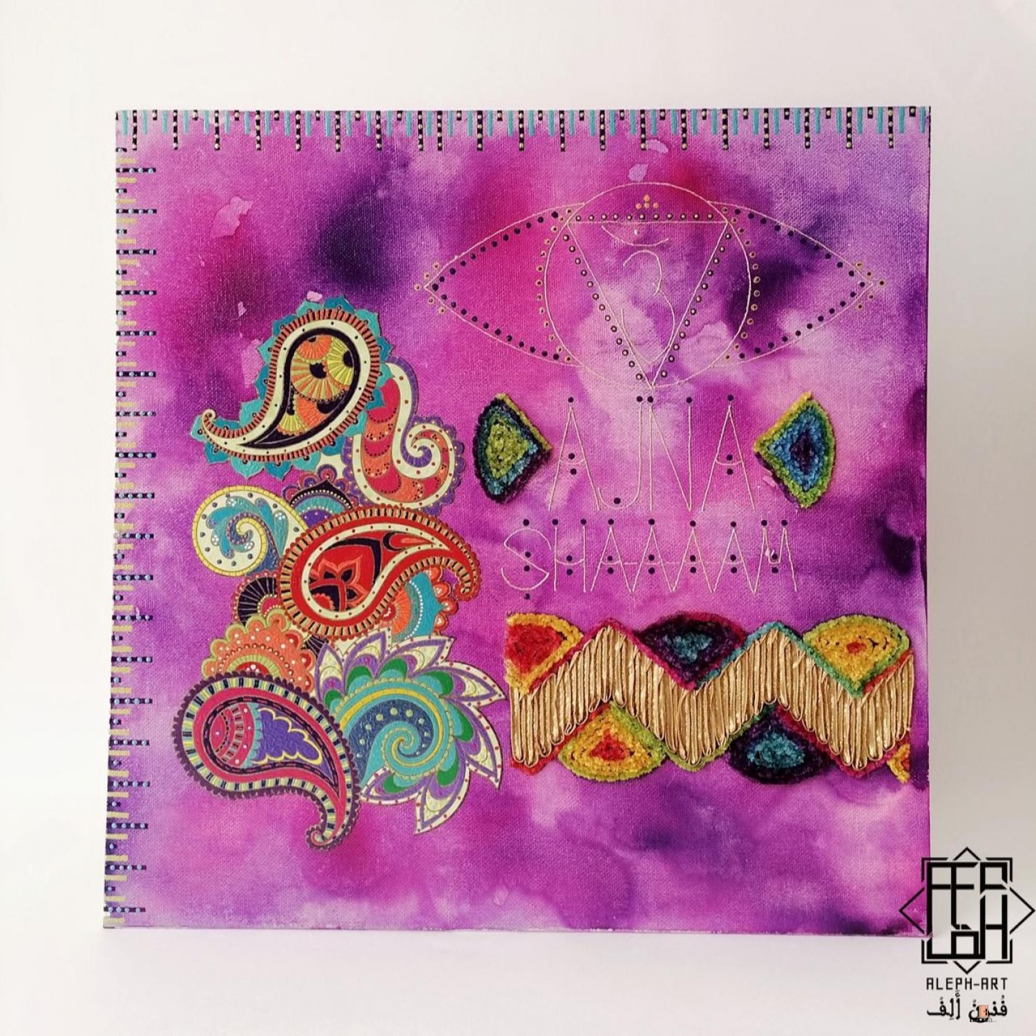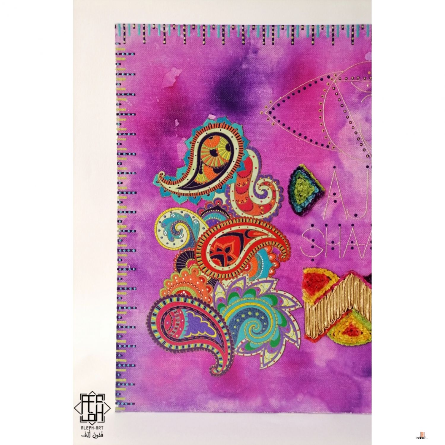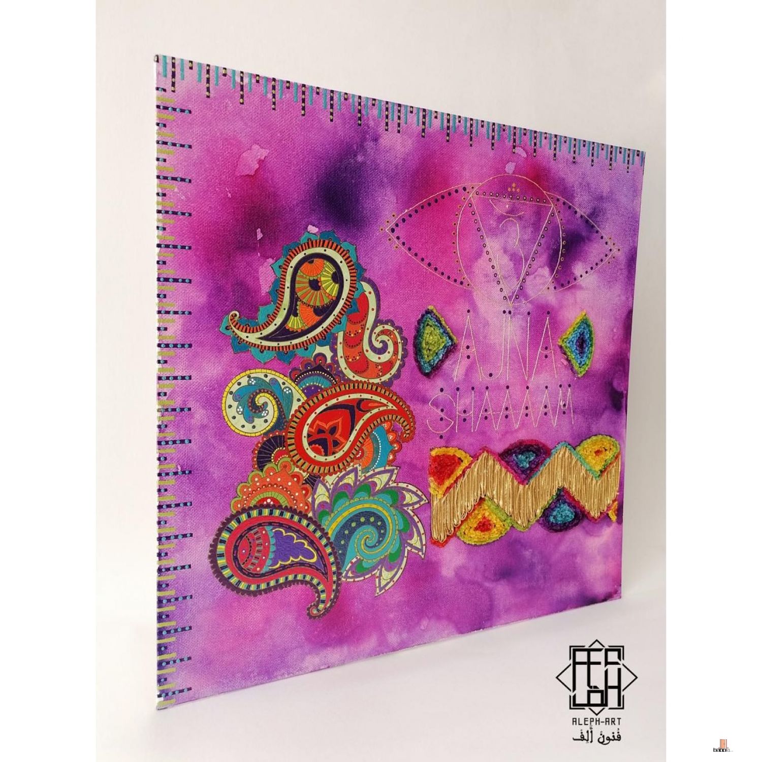 تتميز بحبر أكريليك وألوان أكريليك فرنسية وقطعة قماش مزخرفة،