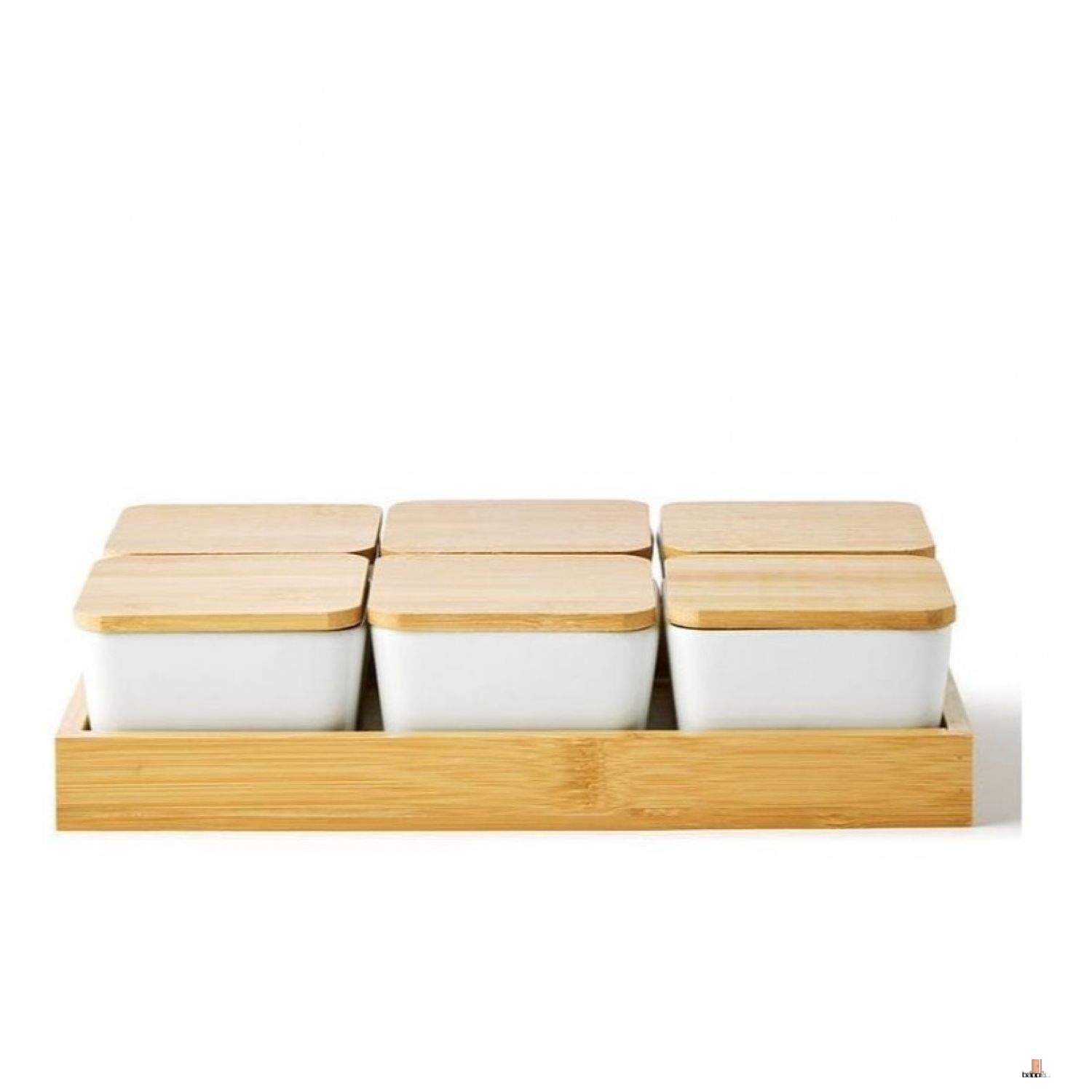 طقم تقديم يتكون من 6 سلطانيات سراميك + 6 اغطاء خشب + صينيه خشب