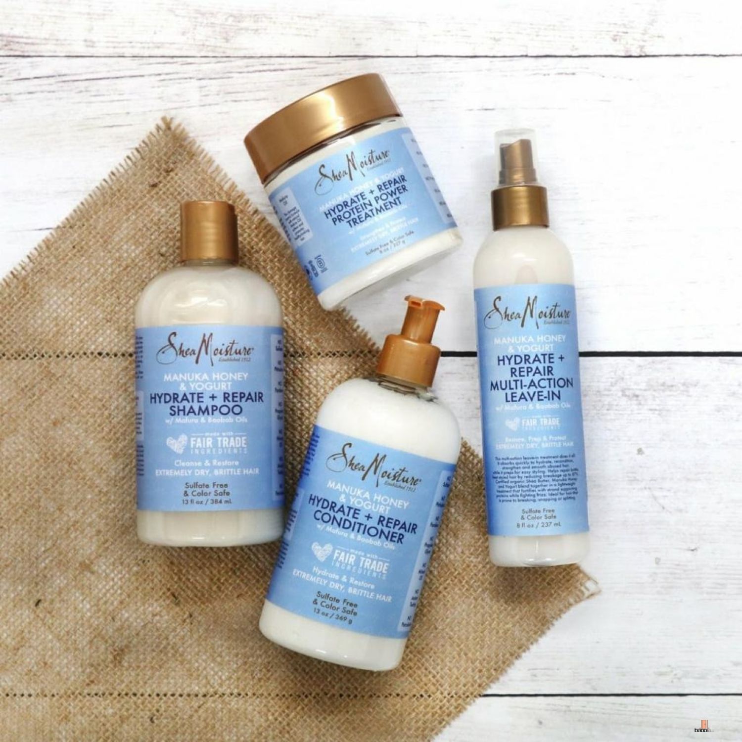 مصنوع من عسل مانوكا ومستخلص الزبادي وزيت المافورا وزبدة الشيا العضوية المعتمدة من SheaMoisture ، هذا الشامبو المرطب للشعر الجاف وظروف الشعر التالف وينعم الشعر