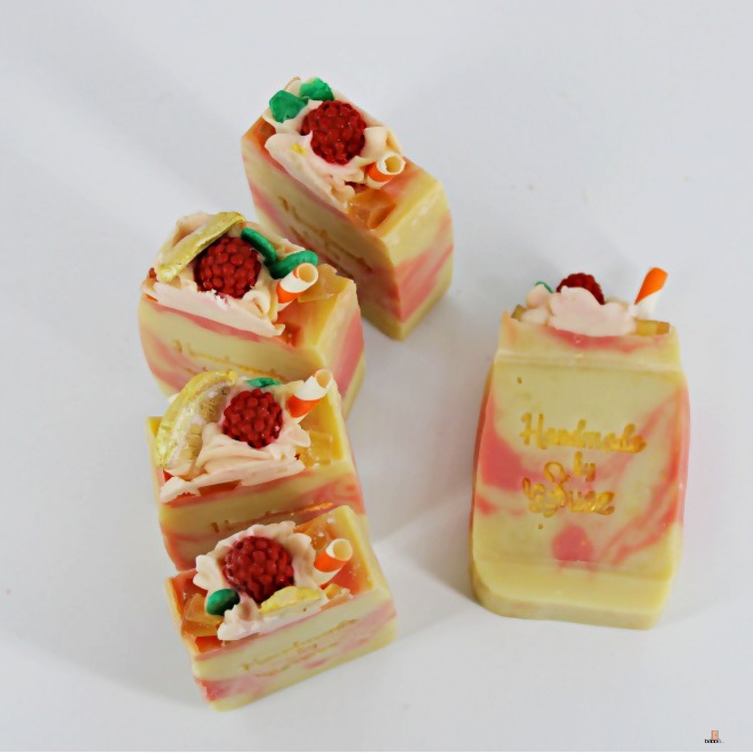 انعش الصيف بهذه الصابونة الرائعة ذات اللون الاصفر و التموجات الوردية المغطاة بكريمة الصابون و حبات التوت و شرائح الليمون!!