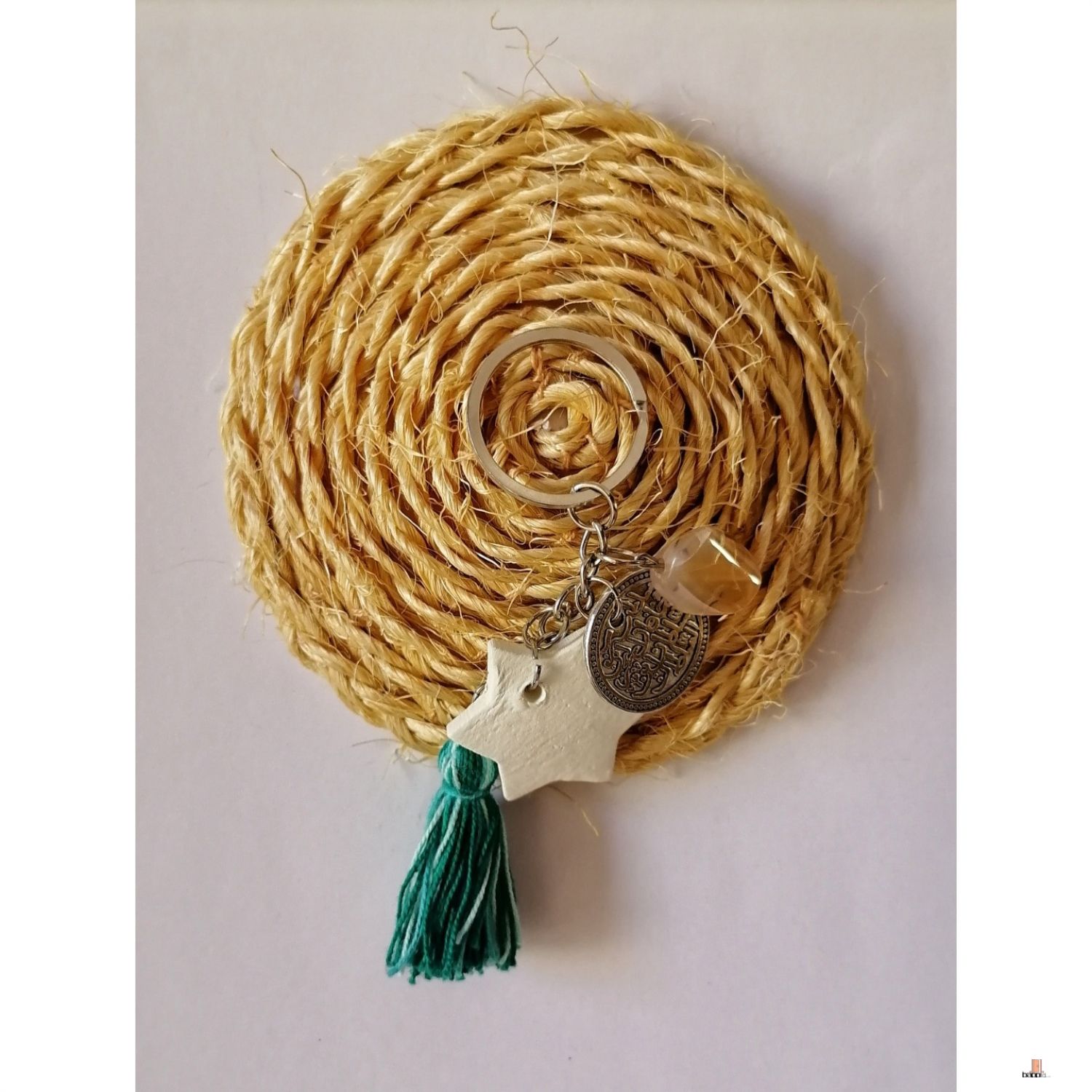 Accessories used are natural Agate stone, silver tinted traditional coin accessory, air-dry ceramic clay & cotton thread hand-made tassels.